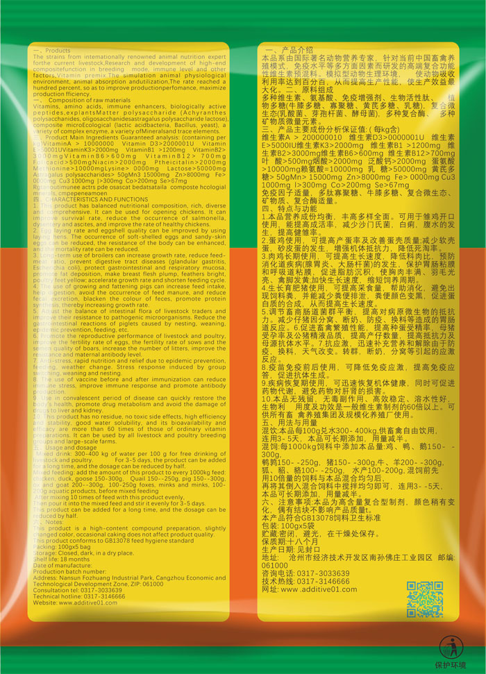 【原料组成】维生素A、维生素D3、维生素E、维生素B1、维生素B2、维生素B6、维生素B12、叶酸、烟酸、泛酸钙、蛋氨酸、赖氨酸、锰、锌、铁、铜等。