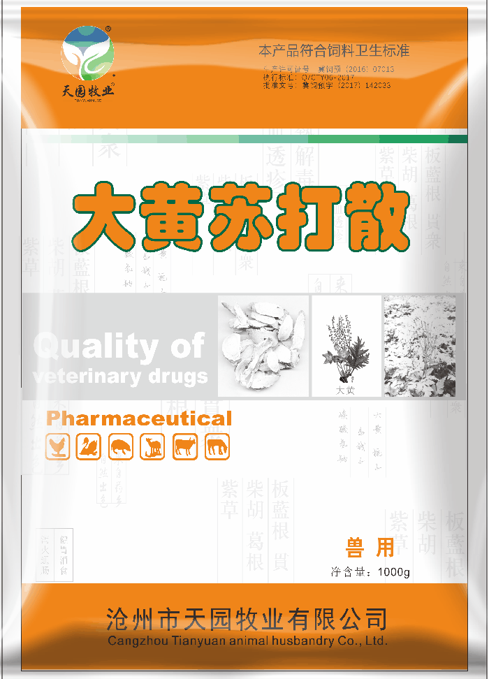 【用法用量】 马、牛50~150g;驼100~200g;羊、猪10~20g;犬、猫3~10g;兔、禽1~3g。用于健胃时酌减。外用适量,调敷患处。鱼每1kg体重5~10g,拌饵投喂;每1m3水体2.5~4g,泼洒鱼池。【不良反应】 按规定剂量使用,暂未见不良反应。【包装规格】 1000g/袋,20袋/件